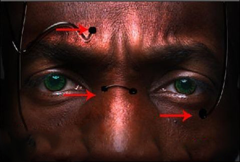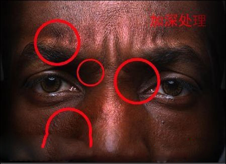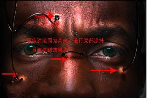 十一、對臉部的玻璃管進行透影處理,(回到人物圖層復制一個圖層,處理錯誤時可以重新開始編輯),用加深工具對示意圖位子進行加深,畫出投影部分,也同時用減淡工具對該位置的亮步進行提亮處理,如圖19-20