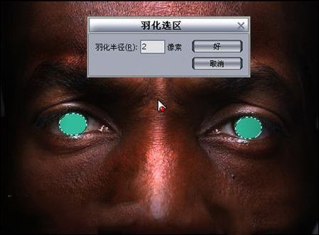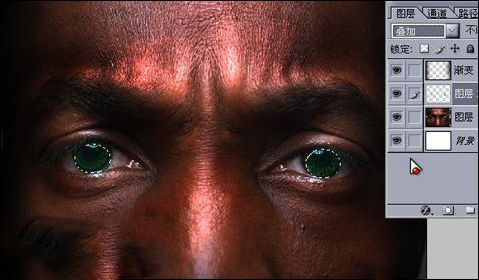 七、人物傳神的終點是眼睛,所以要有其對比性和臉部形成色調上的反差,使得跳出畫面。新建圖層,用選框工具將眼珠部分框選起來,ctrl+alt+d進行羽化2。這里筆者選用綠色做對比,填充綠色在混合模式下選擇疊加模式。如圖7-8。