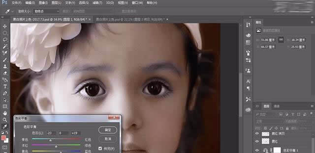 7、再次利用套索工具,選中原圖層的眼睛和眉毛單獨建立一層,使用色彩平衡調整顏色。