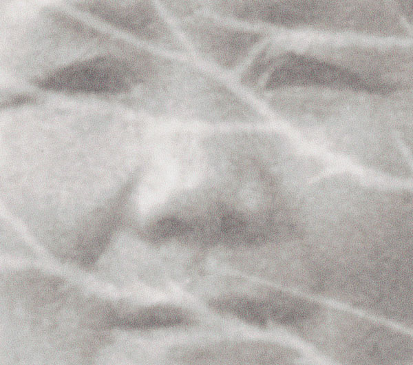 前面的圖片都是完整的小圖,效果的區別不會太明顯,我們放大照片的局部,就可以看到,原始照片放大后五官輪廓已經模糊不清了,而且褪色導致對比度降低,畫面整體太平面有灰蒙蒙的感覺。如果不對細節優化增強,這種打印出照片沒有太大的意義。