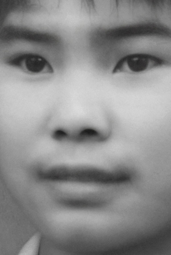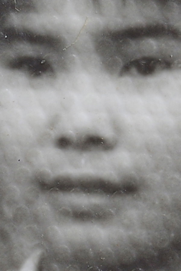 單獨(dú)取出部分,由于當(dāng)時(shí)使用的是絨面相紙,照片掃描放大后就有蛇皮一樣的網(wǎng)紋,且集體照的光線反應(yīng)到個人很平面,對比低,輪廓線條不清晰,在老照片修復(fù)中難度主要是不能準(zhǔn)確定位提高清晰度。