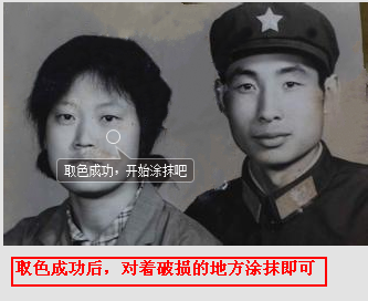 這時候點擊“選取臉蛋膚色”,然后將鼠標移到照片附近,這時候會出現(xiàn)“先選取臉上較量膚色”的字樣,我們可以先從頭發(fā)出開始,對著比較完好的頭發(fā)處點擊選取顏色,接著,會提示“取色成功,開始涂抹吧”,之后,我們就可以用鼠標對著破損的地方涂抹。畫筆盡可能的要小,不然會失真哦,臉上的地方是一樣的,最好要選取肌膚顏色相近的附近部分,然后進行涂抹哦。最后點擊應用。