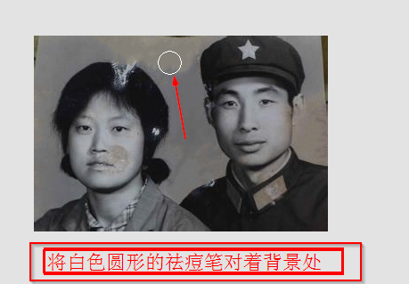 把鼠標放在圖片附近,會顯示圓形的祛痘筆,然后用鼠標對著有破損或者污漬的地方點下去,處理這個的時候要比較細心,用鼠標一個地方一個地方的點,一些微小的污漬可以看情況將祛痘筆調(diào)小一些,不然顯得很失真,破損嚴重的地方可以多點幾下,如圖所示:(祛痘筆僅處理照片背景)處理好以后,點擊“應用”。