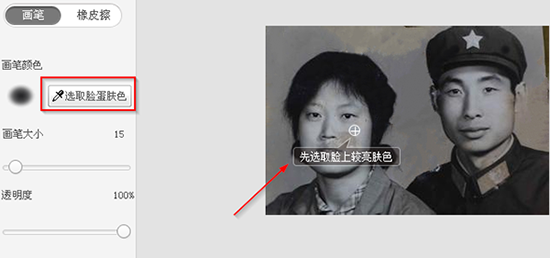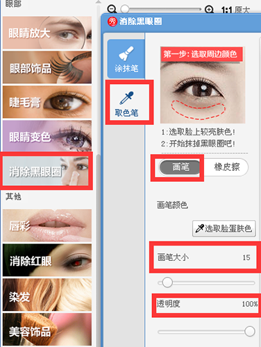 接下來要處理照片的人像。依然要用到左邊的智能美容,這時候需要選擇“消除黑眼圈”,進入到“消除黑眼圈” 的處理框,選擇左邊的工具:取色筆 ,它的作用是可以選取顏色相近的完好部分來涂抹有破損的地方,從而達到修復的作用。因為要處理人的臉部,所以畫筆的大小盡量的調(diào)小,這樣會比較精細看不出痕跡,將畫筆透明度調(diào)小。