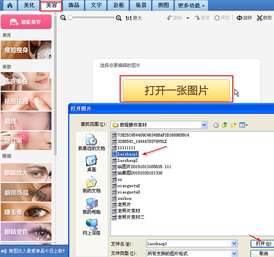 首先將我們的照片的掃描進電腦,運行軟件。在工具欄這里選擇“美容”這一項,然后將老照片添加進來,如圖所示: