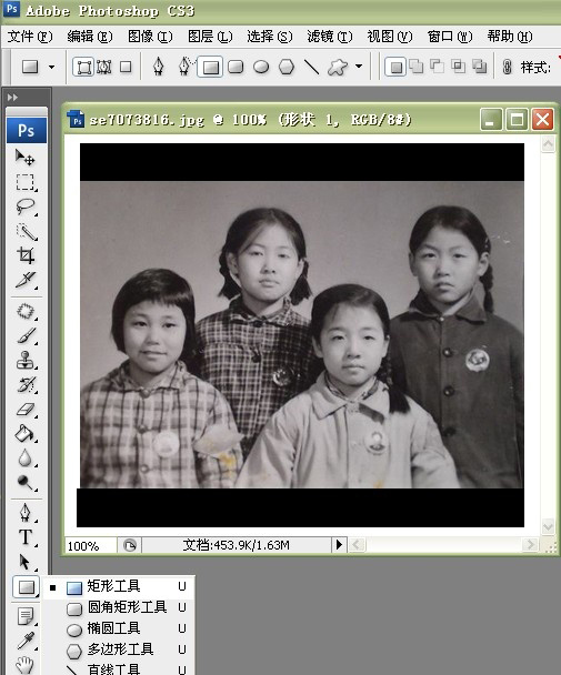 4、選擇工具欄里的【矩形】工具,畫兩個矩形框分別放在老照片頂部與底部的留白處,填充其顏色為【黑色】;