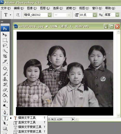 5、選擇工具欄里的【T】字形工具,點擊【橫排文字工具】,錄入需要的字,放在上下部的黑色矩形框里(注意:寫字時,將文字顏色調整為白色);