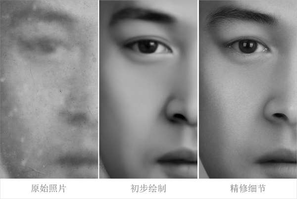 從左至右分別是原始照片、初步繪制、完成效果。通過對比,可以看到修復過程的明顯變化,單獨放大看下面: